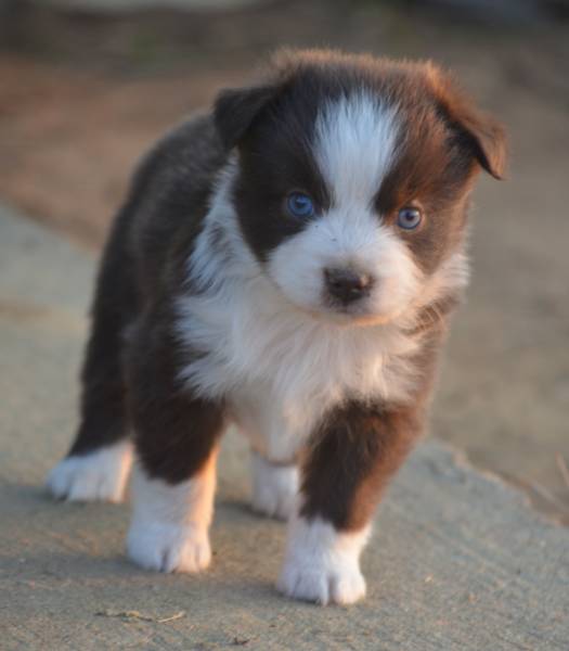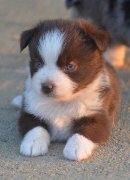 Beautiful markings on this girl. She has a little copper coloring starting to show up. I believe both eyes will be brown. Super velcro dog in the making if you are looking for a new sidekick. She wants to crawl right up in your lap when you sit down.